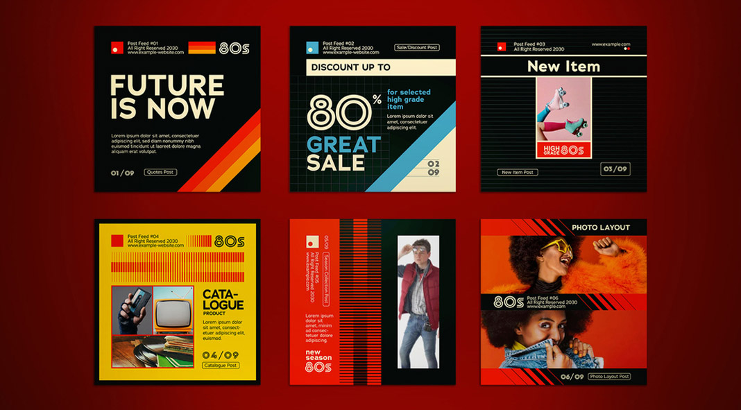 These 1980s-inspired retro Instagram post templates are available for licensing here.