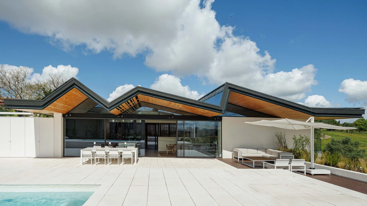 Crowning the Alcoutins House is its most expressive feature: a dramatic, folded roof. This structure is a work of art in itself. Its form is a complex geometry of gabled shapes, drawing inspiration from a diverse mix of influences. One can see echoes of traditional Portuguese rural architecture, the organic forms of tropical vegetation, and the relaxed ethos of a carefree lifestyle. This beautiful roof is clad in durable zinc on the outside, which contrasts beautifully with the warm walnut that lines its interior.