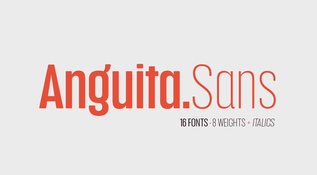 The Anguita Sans font family is characterized by its condensed letter shapes as well as rounded terminals and a large x-height. The modern typeface allows you to create headings and text sections with a distinctive vertical rhythm. Anguita Sans is equipped with eight weights plus matching Italics resulting in a total of sixteen styles. Whether print or digital media, this super-stylish typeface is well suited for plenty of typographic applications including headlines and short text sections.