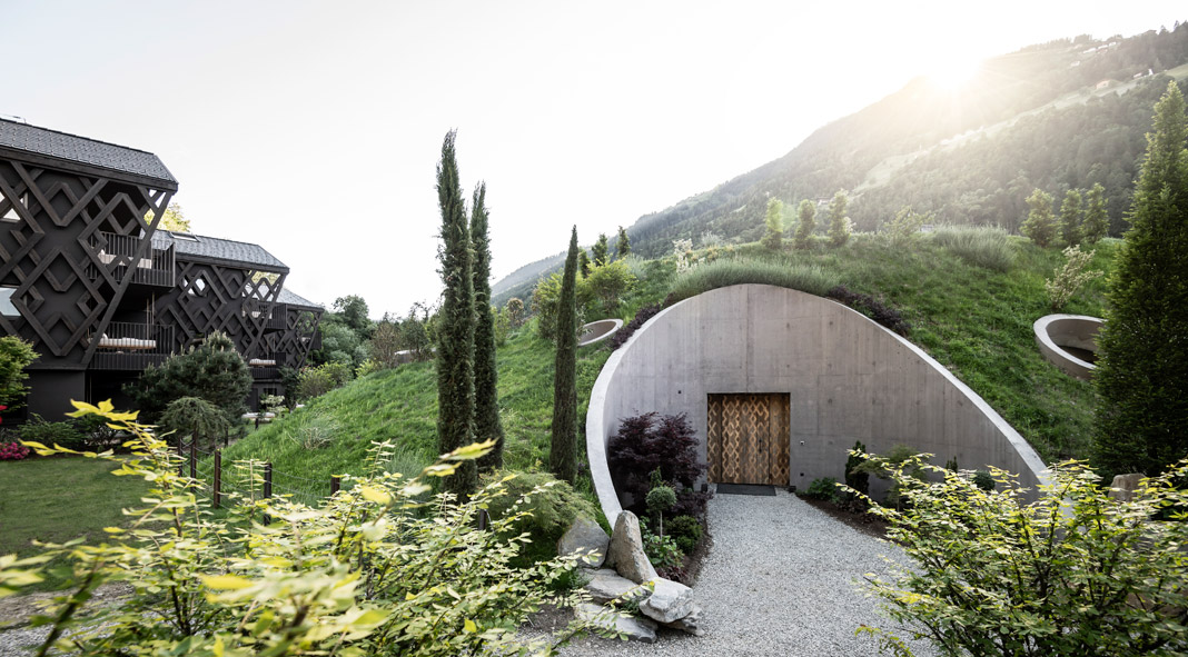 As the central masterpiece of this rural development, noa* designed a wellness area with architecture and greenery that resemble a modern lush garden. A kind of “green heart” that, like the apple-shaped sauna, integrates smoothly and fully into the landscape.