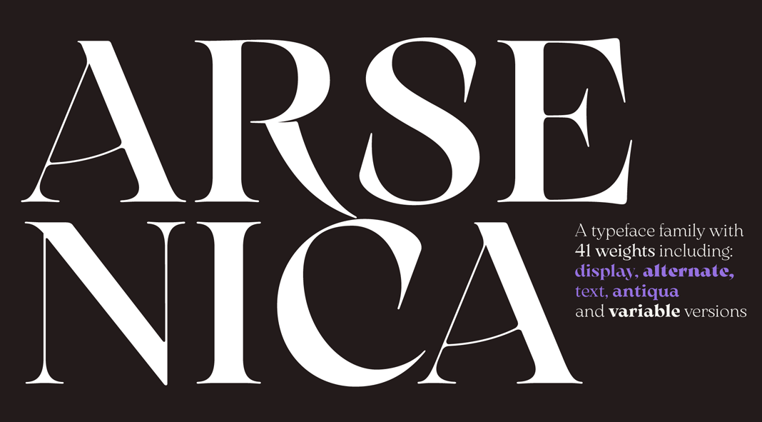 The design of the Arsenica typeface is mostly influenced by good old Italian poster design. Canovaro first designed the Arsenica Antiqua family, made as a serif display typeface that keeps the original Old Style low-contrast with wide proportions and some quirky stylistic inventions. With the Arsenica Display family, he expanded the weight range to include ultrabold weights and lighter weights to give the design a distinct calligraphic touch. In order to bring these letterforms into a contemporary environment with alternate letterforms, Francesco Canovaro developed the Arsenica Alternate family. Last but not least, Arsenica Text has been developed by expanding the design space in the optical size axis, creating a low contrast, strongly readable old-style typeface that works great for long body copy typesetting. The final result is a superfamily consisting of 41 weights. All weights come with numerous OpenType features and support multiple languages. Just click on one of the following links to learn more.