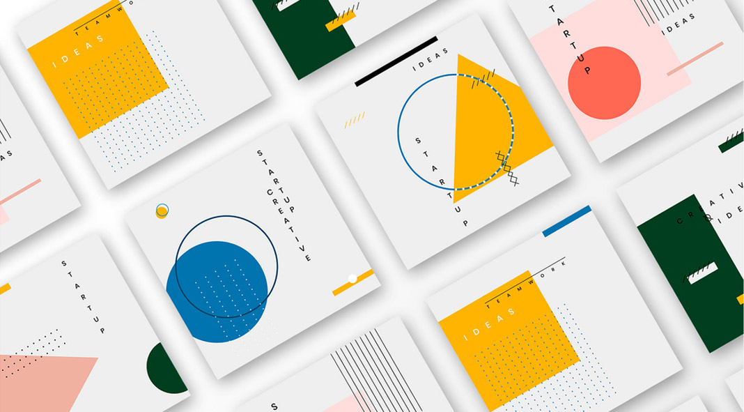 Check out these social media post templates with thin linework and colorful geometric vector shapes inspired by Bauhaus design.
