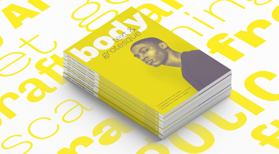 Inspired by the designer’s research in type specimens of the early 20th century, Body Grotesque adds a little more humanist touch to the sans serif modernist design with little imperfections and quirks. Curves have a slightly calligraphic style while a light inverse contrast has been applied to bold weights