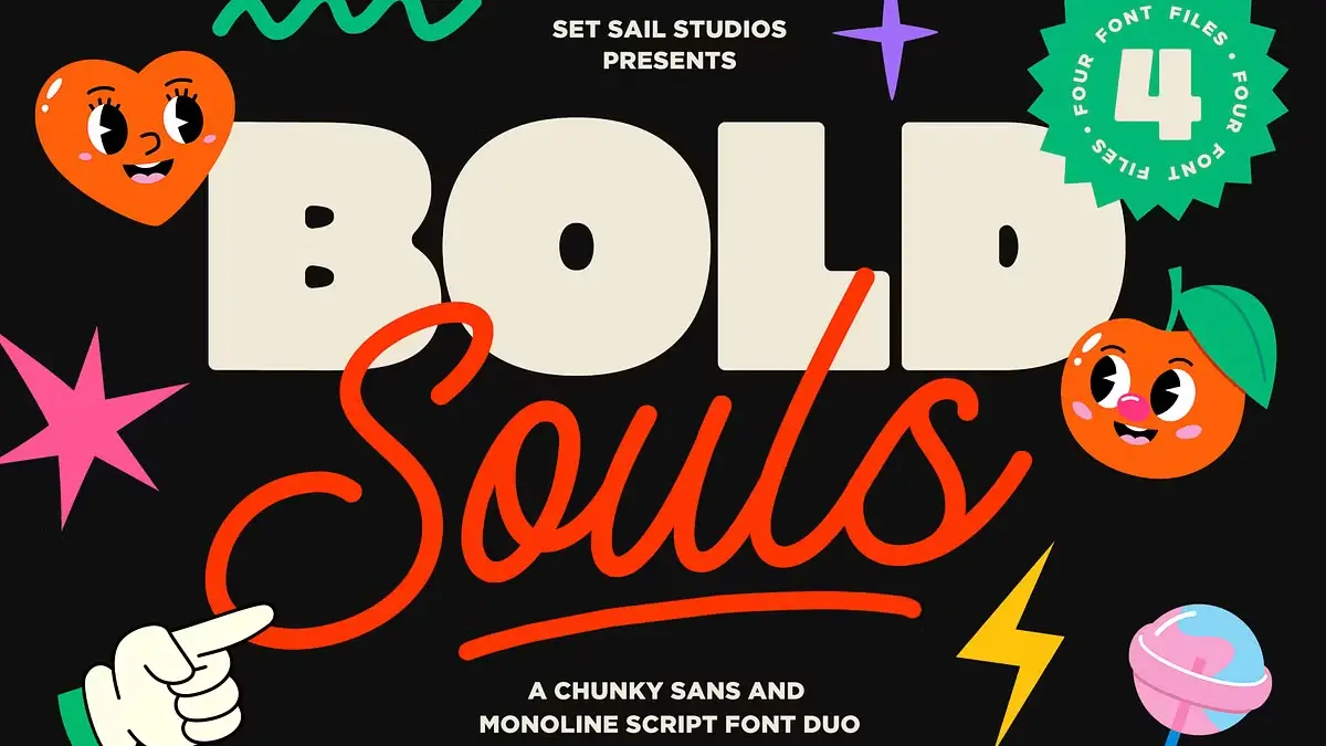 The package contains four distinct files: Bold Souls Sans (extra chunky), Bold Souls Sans Round (softened edges), Bold Souls Script (monoline cursive), and Bold Souls Swash (decorative underlines).