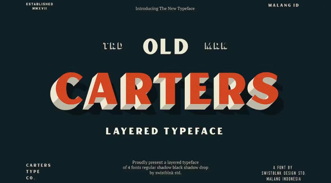 Carters Regular lays the foundation, a solid base for your typographic adventure. Then comes Carter Shadow, adding depth and dimension like shadows dancing in the golden glow of a vintage street lamp. Elevating the experience, Carter Black Shadow introduces a touch of noir, a nod to the mystery of old detective novels.