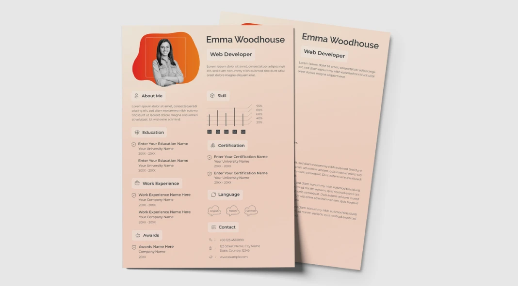 • Placeholder Content: Remember, everything you see – the name “Emma Woodhouse,” the photo, the skills, the work history – is just placeholder content. The template is a blank canvas ready for your information. You simply replace the sample text and image with your own details. It’s designed to be user-friendly in that regard.