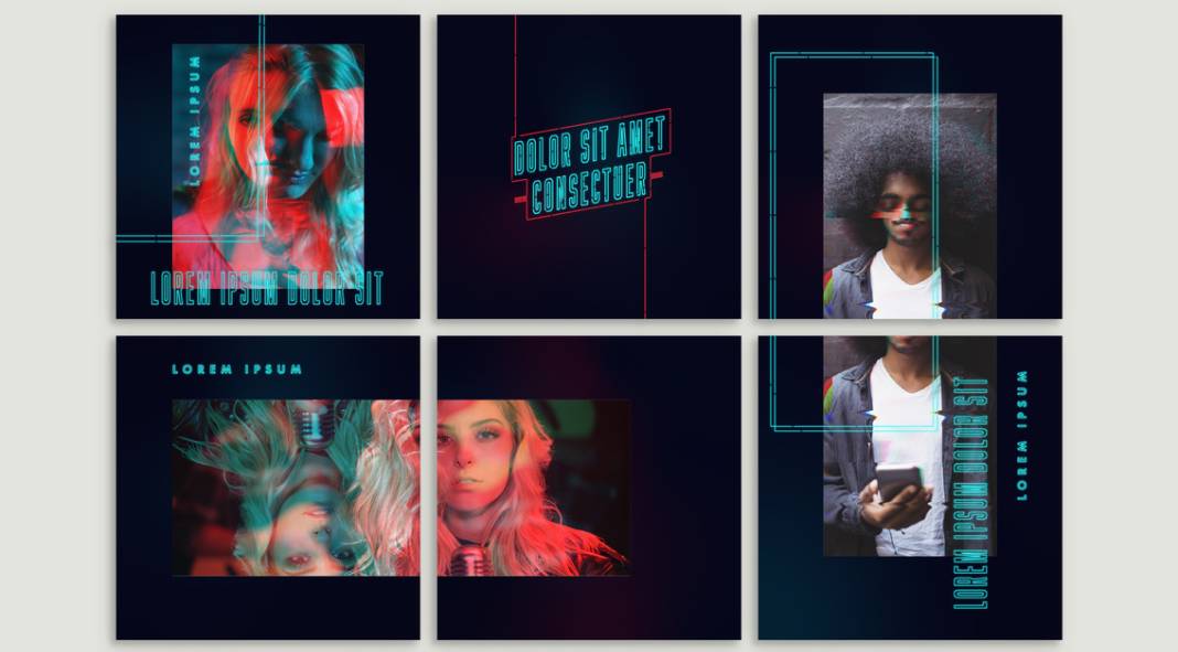 This fantastic set of cyberpunk Instagram post grid templates was designed by Adobe Stock contributor @Wavebreak Media. It comes with 15 individual design options – all in the standard size of 1080 x 1080 px. They are fully editable. With just a few easy clicks, you can add your own text and images to the layouts. The posts share the same cyberpunk style including a uniform color scheme. This way, you can visually enhance your Instagram account with a full retro-futurist grid.