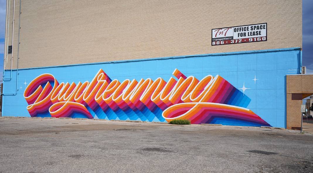 What truly sets this mural apart is Gonzalez’s artful manipulation of typography. The word “Daydreaming” is rendered in a stylish script, each letter crafted with meticulous precision. The script not only flows elegantly across the wall but also incorporates a cool 3D effect, adding depth and dynamism to the overall composition. As sunlight dances upon the surface of the mural, the interplay of colors and shadows creates a visual spectacle that enchants viewers, inviting them to delve into the realms of their own imagination.