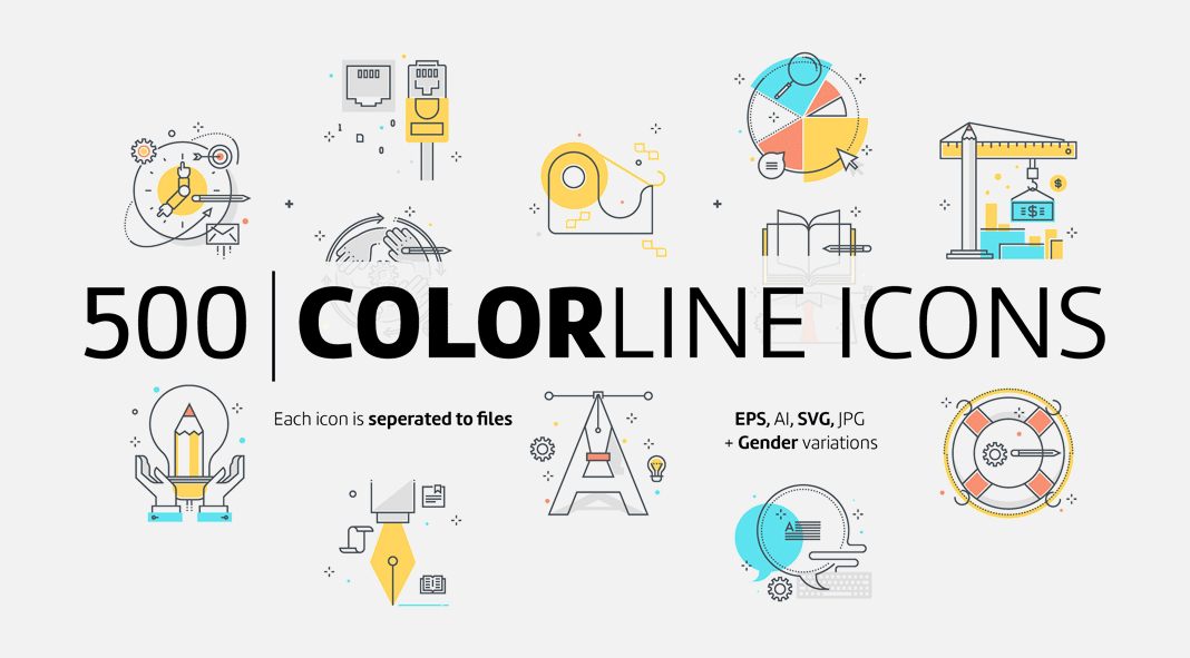 Designed and published by the team of Howcolour, this modern and minimalist collection of line icons is well suited for both print and web design projects. Thanks to the use of vector graphics, everything is still fully editable. You can change the size as well as any color and shape just the way you want it. The line icons were made using a grid of 198 px with 2 px outlines. In addition to the vector files (AI, EPS, SVG), the set includes JPG files for every icon. The full collection is organized in numerous categories such as business, finance, development, technology, construction, education and school, energy industry, green energy, game development, growth hacking, insurance, law and justice, office tools, personality, project development, real estate, shopping, and network.