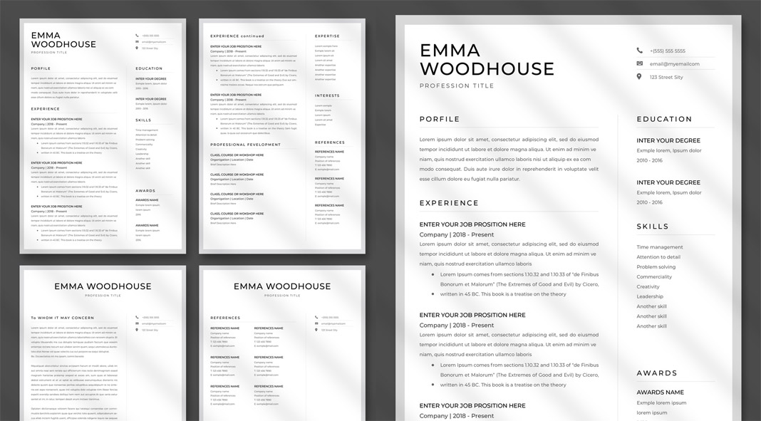 Created by Adobe Stock contributor @PixWork, this minimalist resume template has been designed in the standard size of A4. It consists of four fully customizable pages. The clean, minimalist look makes it a great choice for a wide range of job applications.