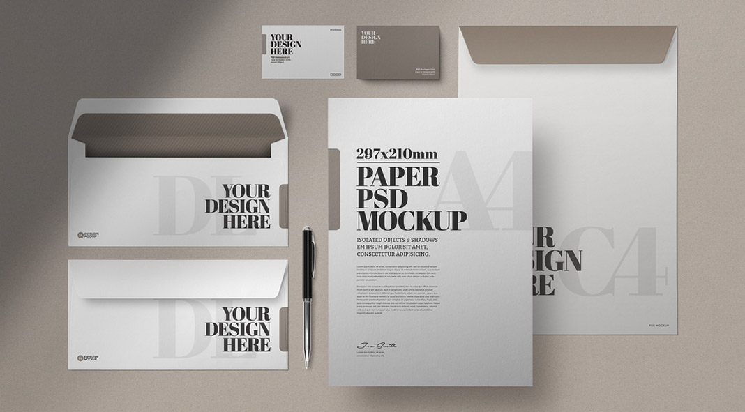 Available at Adobe Stock, this collection of stationery Photoshop mockups includes business cards, envelopes, and letterheads.