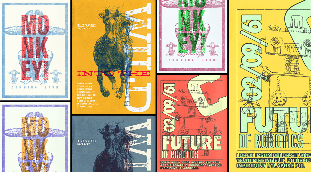Available as fully editable Photoshop files, this bundle of vintage overprint poster design templates can be downloaded for free with an Adobe Stock trial subscription.