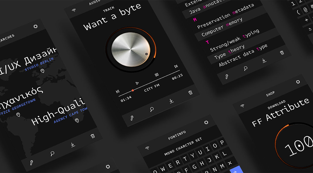 Designed in 2017 by Viktor Nübel for foundry FontFont, the FF Attribute Text font family provides an industrial touch, while maintaining a minimalist look and feel. Equipped with 7 weights plus true Italics, this family can be used for numerous applications such as diverse headlines, banners, posters, branding, blog posts, websites, etc. Whether print or on screen, this family is such an eye-catcher. FF Attribute actually consists of two families; Mono and Text. The Mono version is based on a fixed width (monospace) design, while the Text version is based on a proportional design. The family also includes Greek and Cyrillic letters as well as alternates and fractions. Even a huge range of box-drawing characters and user interface-icons is included. For further information, just follow the link below.