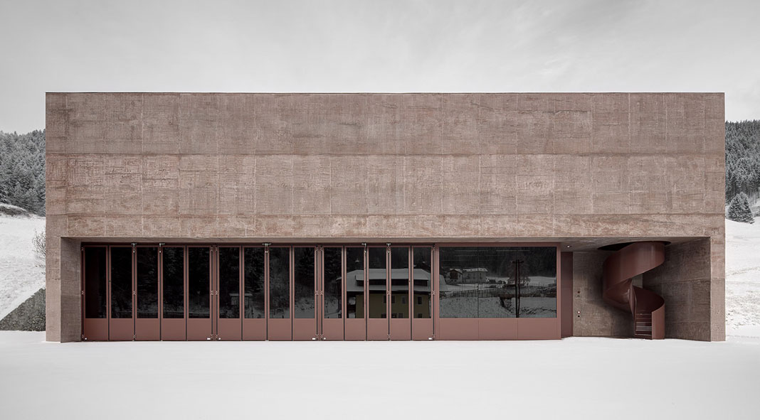 The team of Pedevilla Architects designed a new fire department located at 1,130m above sea level. The architectural concept is based on a clear, compact structure. The red color is a symbol of functionality. In addition, it underlines the independence of the new building. The structure creates an upper place and a lower place, with the upper (hall) and lower rooms (vehicle hall). Special attention has been paid to the robust and simple construction. Structural lightweight concrete was used as the perfect material. As a contrast to the solid concrete, stone pine and local loden were used for the hall, which is also a meeting point for the residents of Vierschach.