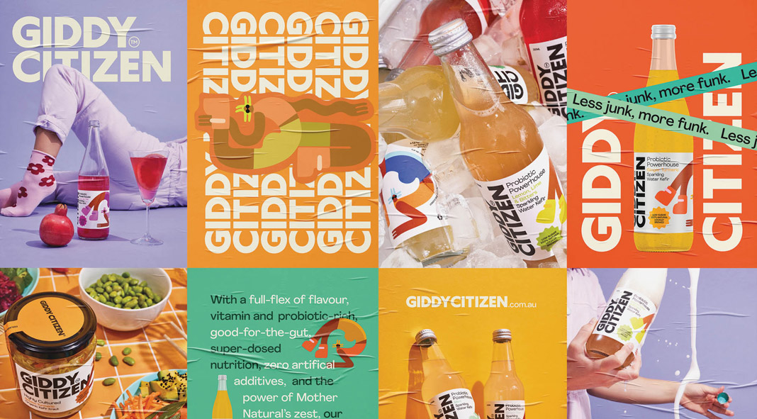 “A custom-illustrated hero character presents a unique, eye-catching mascot with an infectious spirit to boot. A bold wordmark seeks to match the punch of flavor found in Giddy Citizen products, with a soft edge that feels both friendly and inviting. The result is a thoughtfully considered brand identity elevating a unique brand voice in the wellness space that feels as comforting as it does exciting—delivering serious results in the silliest way.”