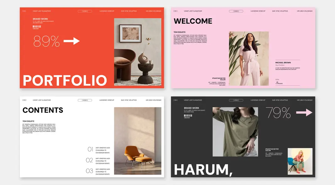 - Attention-Grabbing Details: The bold use of color blocks, clean typography, and dynamic image placement draw attention to key elements of the portfolio.