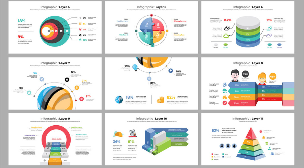 Create screen presentations with eye-catching infographics using these fully customizable templates.