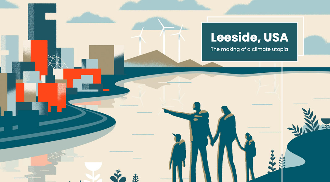 Matt Chinworth is a Tulsa, OK-based illustrator mostly specializing in a range of editorial artworks. Commissioned by QUARTZ, Matt Chinworth has illustrated a series of posters and postcards promoting Leeside (a fictional US city of the future) as it welcomes migrants from coastal cities with its green initiatives and sustainability.