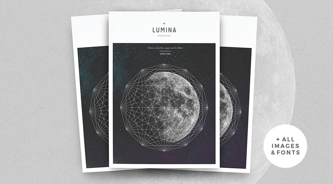 LUMINA, a multi-purpose Adobe InDesign magazine template with free images, fonts, and graphics.
