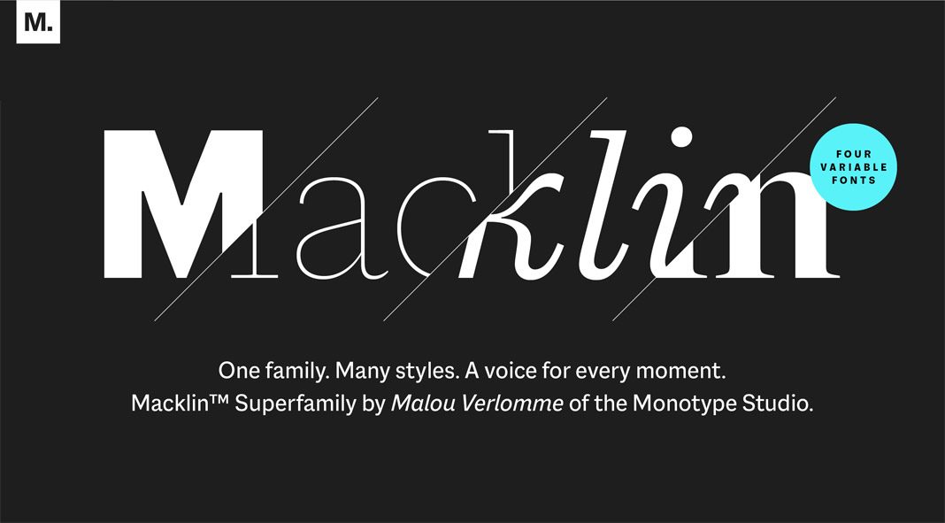 Designed by the award-winning typeface designer Malou Verlomme for the Monotype Studio, the Macklin font family is inspired by the time when type moved beyond books and was used in eye-catching street posters or advertisements.