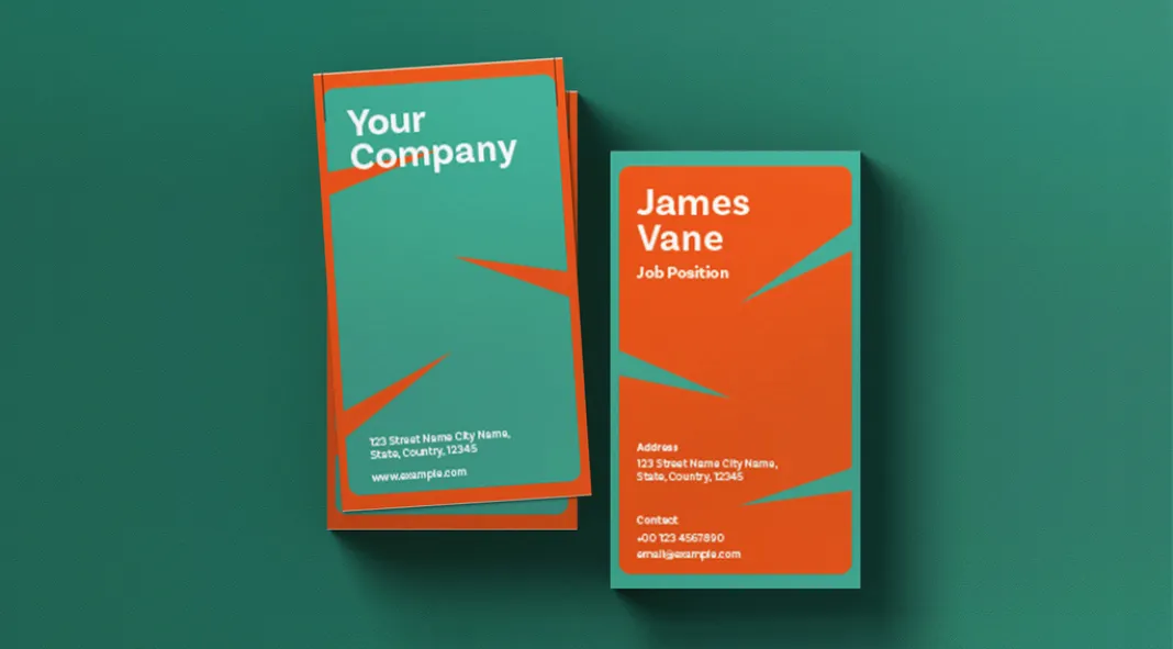 Take a look at the design itself. It’s got this awesome combination of teal and vibrant orange. The colors are bold and energetic, right? It’s not the usual boring color palette. The sharp, angled lines add a dynamic, modern touch. They almost seem to slice through the design. It makes it even more visually appealing and intriguing. These design elements ensure that your card won’t be easily overlooked.