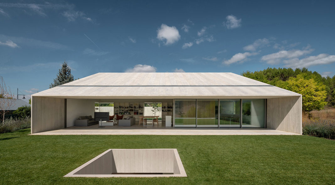 A modern and minimalist villa situated on a hillside property in Pamplona, Spain.