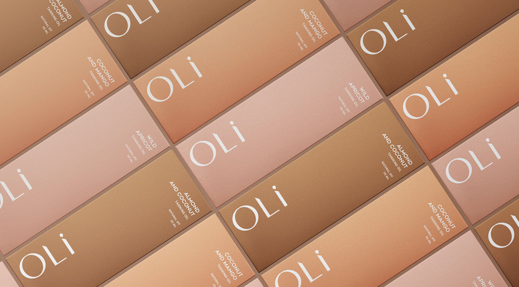 A restrained brand identity developed by Anastasia Dunaeva for the tanning oils of OLI.
