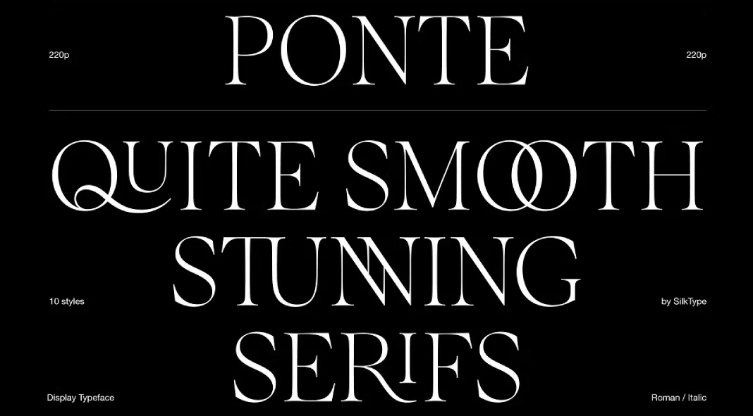 Ponte, a Modern Serif Masterpiece for Elegant Headlines: Exploring the Features, Versatility, and Design Potential of Silktype’s High-Contrast Display Typeface