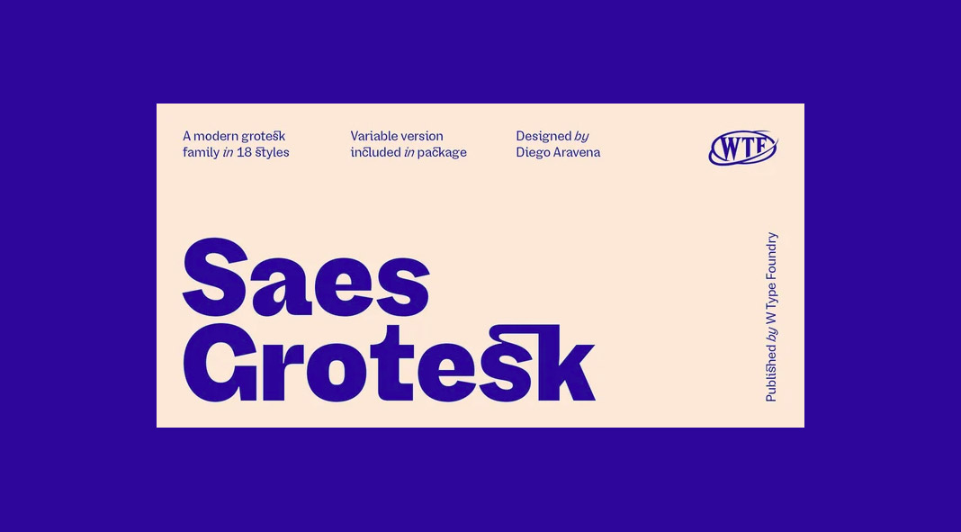 Designed in 2021 by Diego Aravena Silo of foundry W Type, Saes Grotesk is a new sans-serif font family that masterfully combines the beautiful imperfections of some of the first sans serifs with the trend and standards of today’s typography.