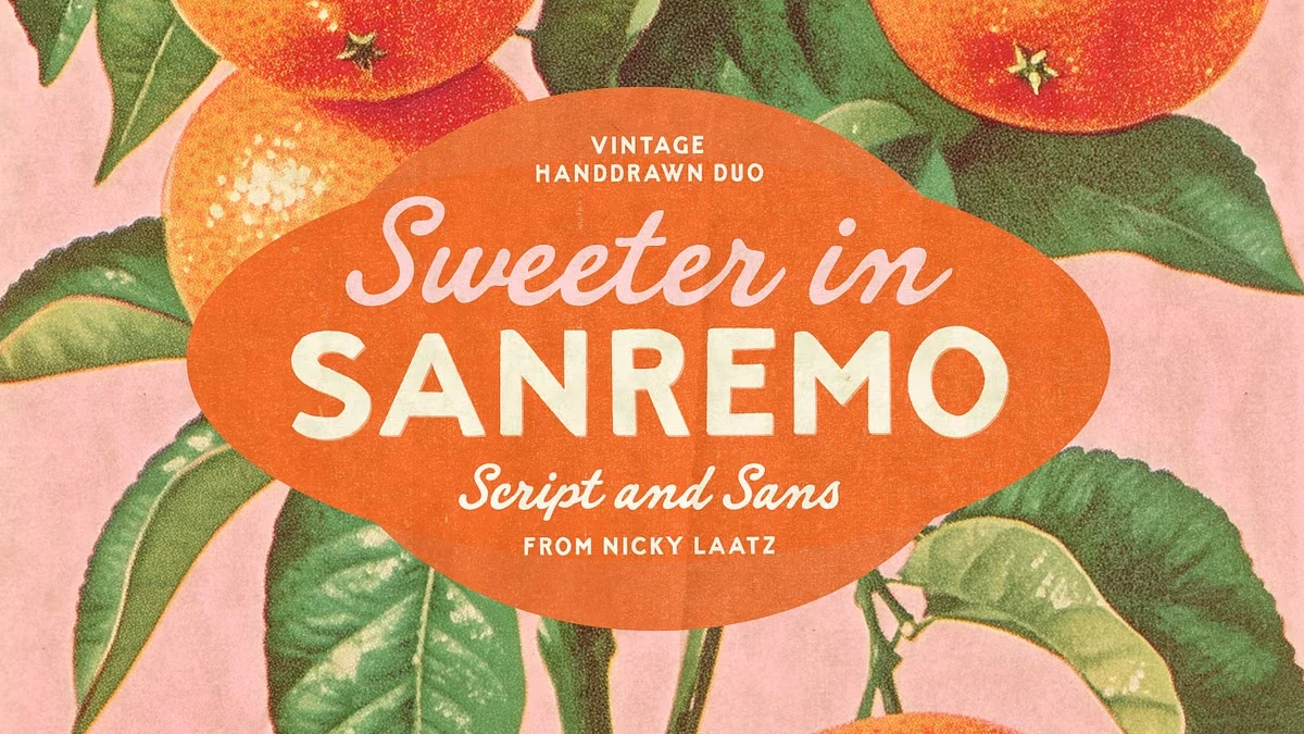 Retro design dominates current trends. Authenticity matters more than ever. The Sanremo vintage font duo from Nicky Laatz arrives at the perfect moment. This pairing captures the charm of 40s and 50s hand-painted signs. Think old matchbooks, classic cocktail lounges, and sun-faded advertising. Nicky Laatz designed Sanremo to offer modern creatives instant nostalgia without cliché.