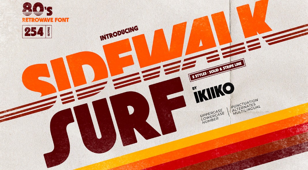 The 1980s was an era defined by its vibrant culture, electric colors, and dynamic energy. It’s a time that continues to inspire artists, designers, and creatives today. Channeling this nostalgic fervor, Sidewalk Surf, a bold and dynamic font designed by ikiiko, brings the 80s retrowave culture back to life with striking precision.