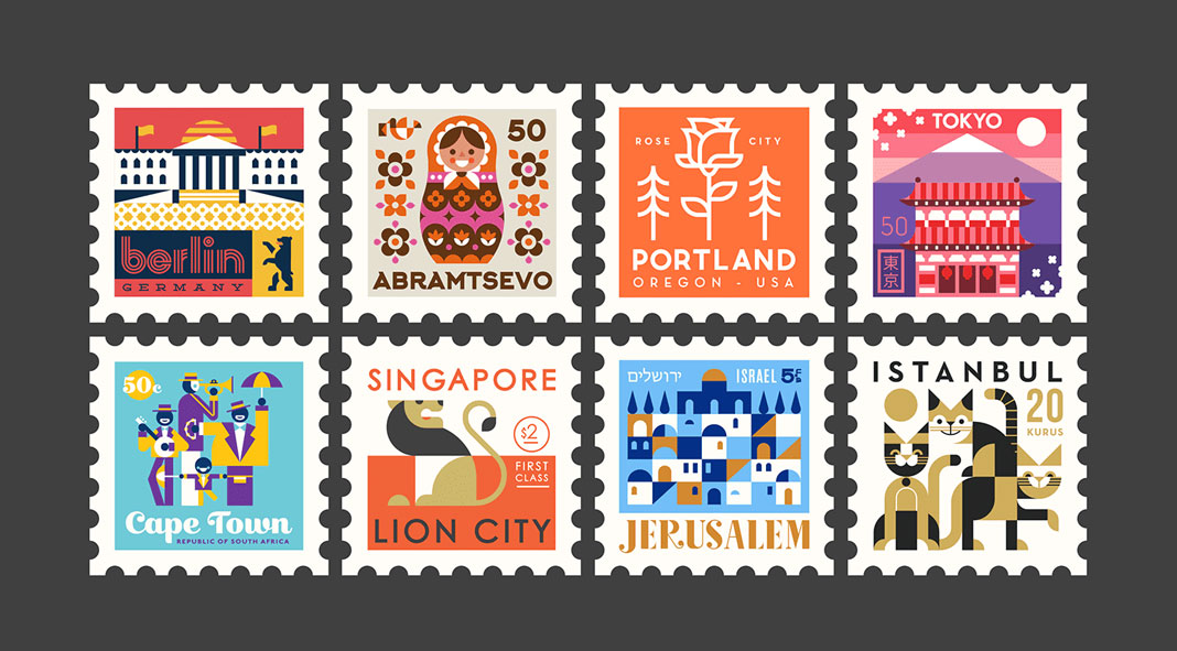As a tribute to the art of postage stamp design, the team of graphic design studio Makers Company has produced a series of well-illustrated stamps featuring a variety of cities and towns. All stamps are made in a square format based on flat illustrations in different colors and shapes.