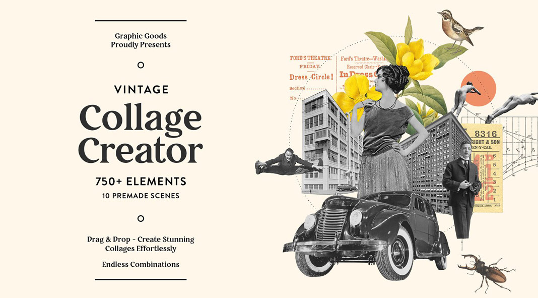 Created by the team of Graphic Goods, a small studio specializing in creating illustrations, templates, fonts, and other vintage-inspired graphic design resources, this amazing vintage collage creator is packed with 750+ design assets sourced from a variety of vintage photos, illustrations, art, and ephemera.
