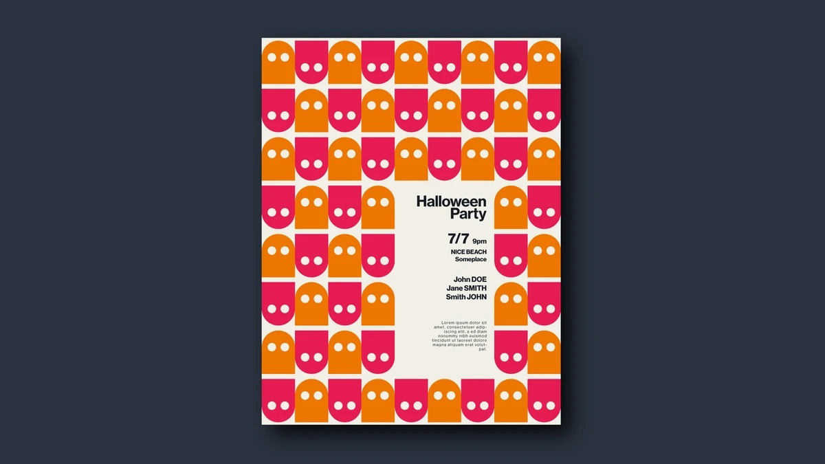 Ultimately, the strength of this design by Jozef Micic lies in its smart combination of playful concept and minimalist execution. It is a Halloween party poster template that respects the viewer’s intelligence. It doesn’t need to spell out “spooky” in a dozen different ways. The charming ghost pattern is enough to evoke the spirit of the holiday.