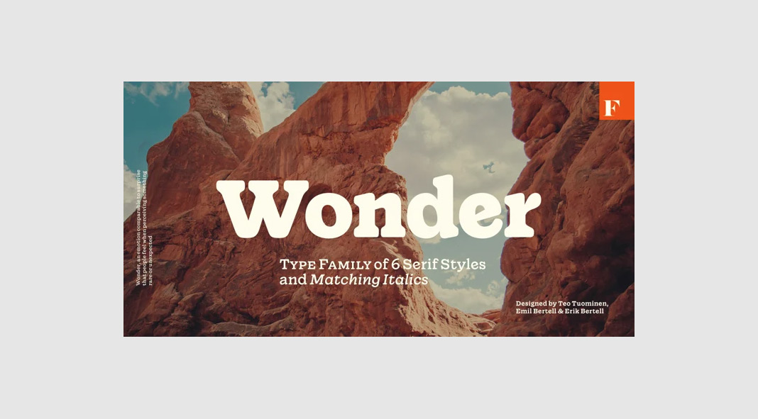 Designed by Emil Bertell, Erik Bertell, and Teo Tuominen for foundry Fenotype, the Wonder font family is now available in six weights plus matching italics for each weight. Its friendly serif typeface offers a nice organic look and feel. Despite the kind of rustic flair, the Wonder font family is well suited for contemporary designs including branding, packaging, mobile apps, just to name a few. The Wonder font family is also equipped with several typographic features such as multiple numeral styles (old-style figures, tabular figures, subscript and superscript numerals), small capitals, and swashes. Just click on the following link to learn more.